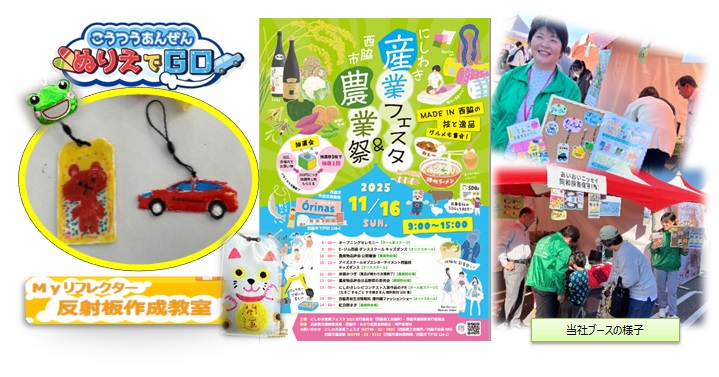 11月16日(日)9:00~15:00 西脇市役所駐車場にて「2025 西脇産業フェスタ&農業祭」が開催されました。 新鮮な野菜の直売会や播州織、播州ラーメンなどのグルメブースが多数出展する中、当社は「リフレクター」「ぬりえでGo」を出展し、子供たちを中心に参加頂き大盛況でした。当日は晴天に恵まれ、多くの方に来場いただきました。リフレクターでは、プロ顔負けのアニメを上手に描いている子もいました。個性豊かで楽しいですね。