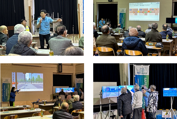 2025年12月3日(水)富山市との連携事業として、シルバー交通安全教室にてシミュレータによる交通安全教室を開催しました。(参加者 25名) 講師は一般財団法人 日本交通安全教育普及協会の井澤さんと赤間さんでした。 富山市では本イベント初開催となりました。今月、横断歩道を渡っていた高齢歩行者が高齢ドライバーにはねられて死亡する事故が発生、法令違反を起こしていなくても事故に巻き込まれるかもしれないことをシミュレータで安全に体験いただきました。 当社からは、『高齢ドライバー交通安全ガイド』を用いて補償運転を説明、健康寿命とともに運転寿命も伸ばしましょうと説明しました。