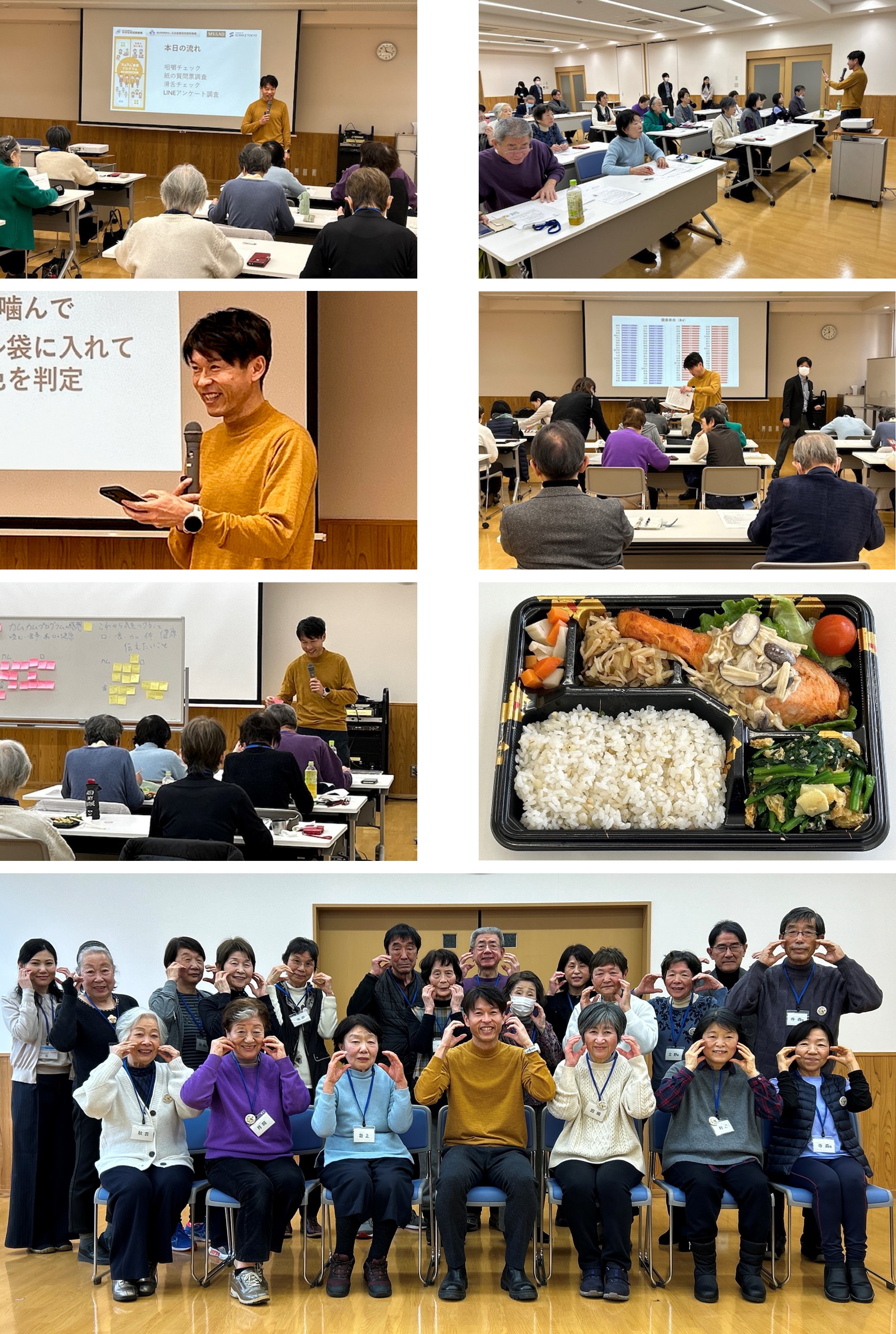 2026年1月13日(火)富山市との包括連携協定に基づき、カムカム健康プログラム④を開催しました。(4回シリーズの最終回) 最終回は再び東京科学大学の松尾先生が来県。滑舌・咀嚼チェック、各種アンケートの依頼、健康寿命と平均寿命についてお話しされました。 お弁当調理をご担当いただいた、食のコンサルタントブーケさまから本日のレシピ紹介、お店PRもありました。 カムカム弁当を召し上がりながら、イベント参加のご感想や今後気をつけたいことを数名発表いただき、とても充実した最終回となりました。みなさま、本当にありがとうございました! |