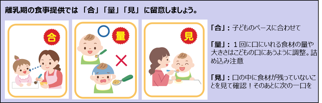 離乳完了期の万が一発生した際には速やかな対応が求められます。食事中に眠ってしまった時など、普段から口腔内の異物除去を2名体制で行い、その方法を確認しておくと良いでしょう。