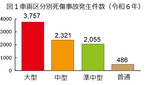 ■車両区分別では、大型車が3,757件(うちトレーラ656件)(43.6%)、中型車が2,321件(26.9%)、準中型車が 2,055件(23.8%)、普通車が486件(5.6%)となっています(図1)。