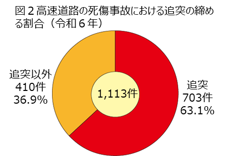 ■追突について、高速道路(高速自動車国道と自動車専用道路)での発生状況を見ると、高速道路全体の死傷事故1,113件のうち追突は703件となっており、高速道路における死傷事故の63.1%を占めています(図2)。
